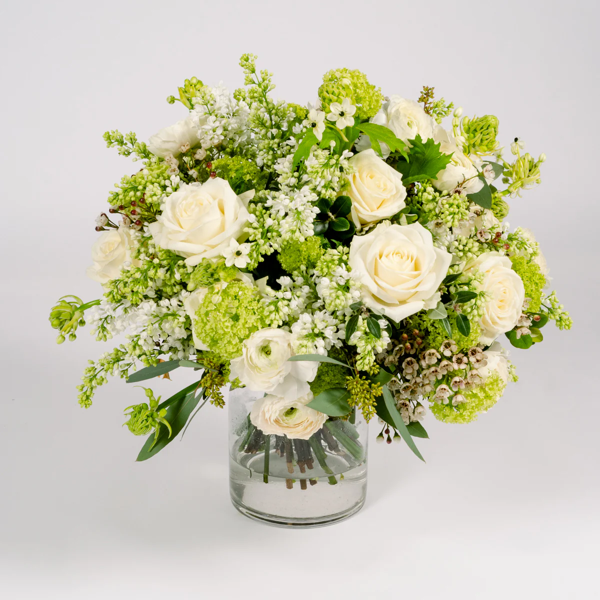 The Apsley bouquet is a truly abundant and fresh combination of porcelain white ranunculus, white lilac, large white roses and textural white wax flower. Our expert London florists have also added vibrant green viburnum and seasonal foliage varieties to create a design which has an organic sense of movement, resulting in a glorious flower arrangement for any occasion or celebration.