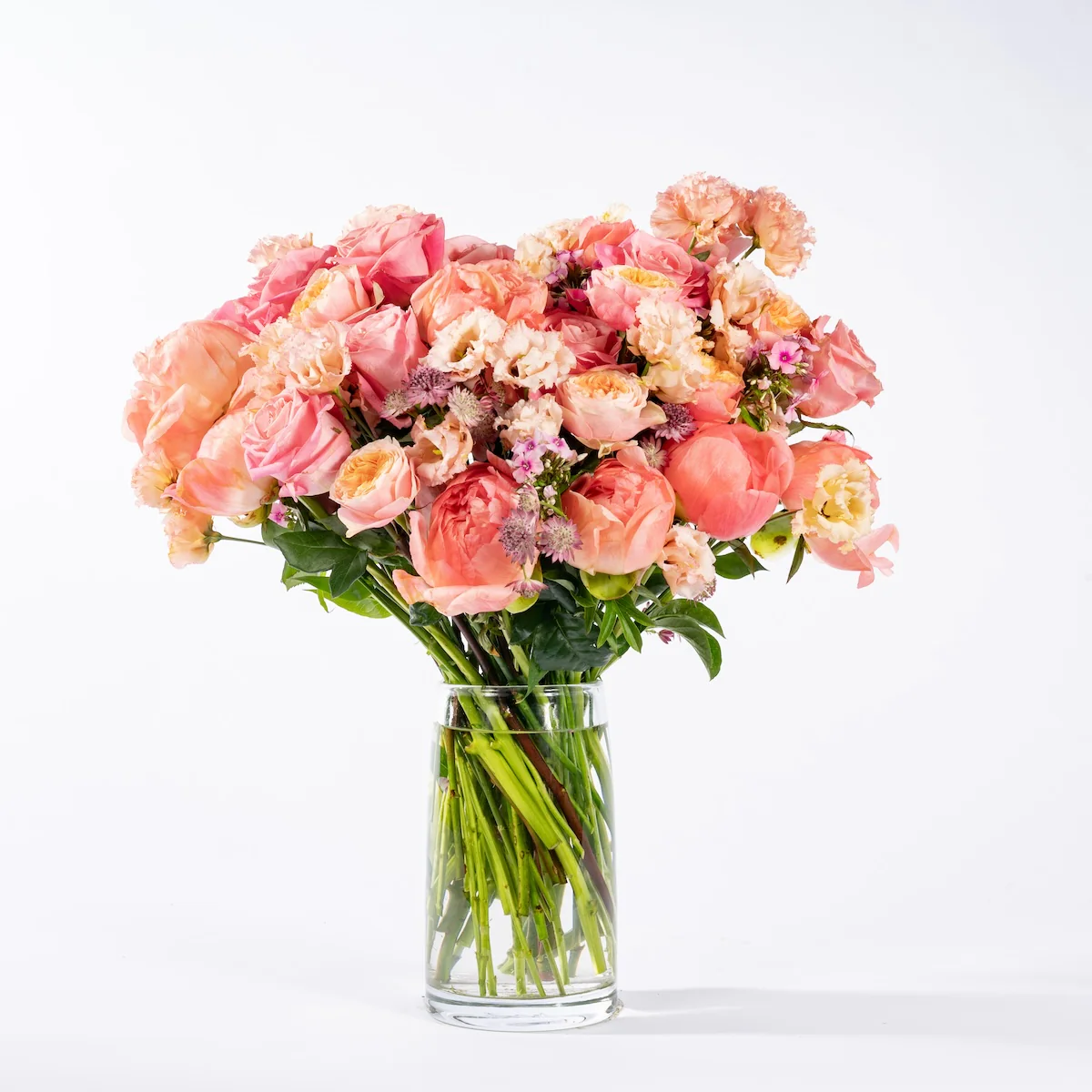 A Spring inspired combination of soft pink lisianthus, roses and coral coloured peonies makes up the truly abundant Coral Peony bouquet. Our expert London florists have also added seasonal foliage to create a flower arrangement which has an organic sense of movement and exudes a sense of romance. Wrapped in fully sustainable packaging using our signature style.